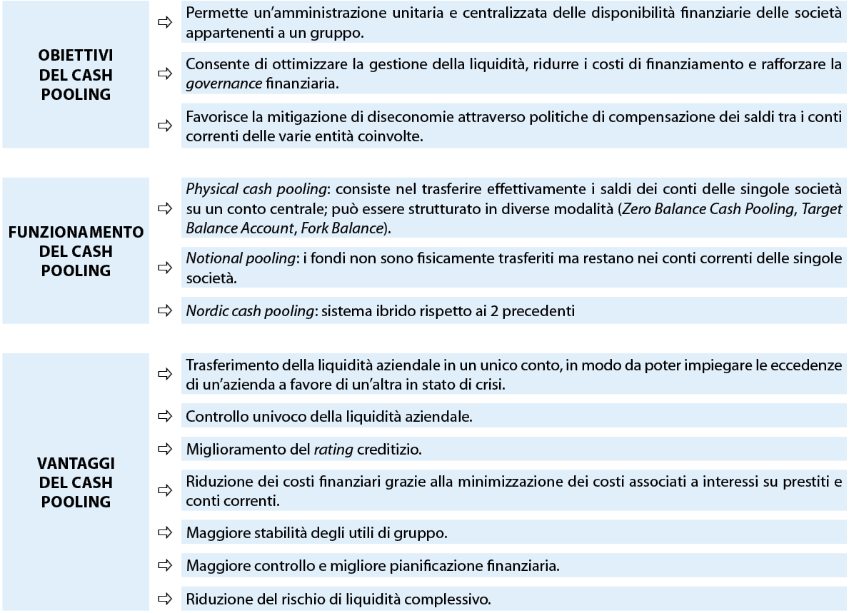 In generale, il cash pooling rappresenta uno strumento tipico di gestione centralizzata della tesoreria. Il meccanismo coinvolge diversi soggetti: la banca, la pool leader (o master) e le società partecipanti, che concordano la centralizzazione delle operazioni di tesoreria tramite un accordo contrattuale. Tale regolamentazione definisce i flussi tra i conti delle singole società e il conto master, permettendo una gestione unitaria e coordinata della liquidità di gruppo.