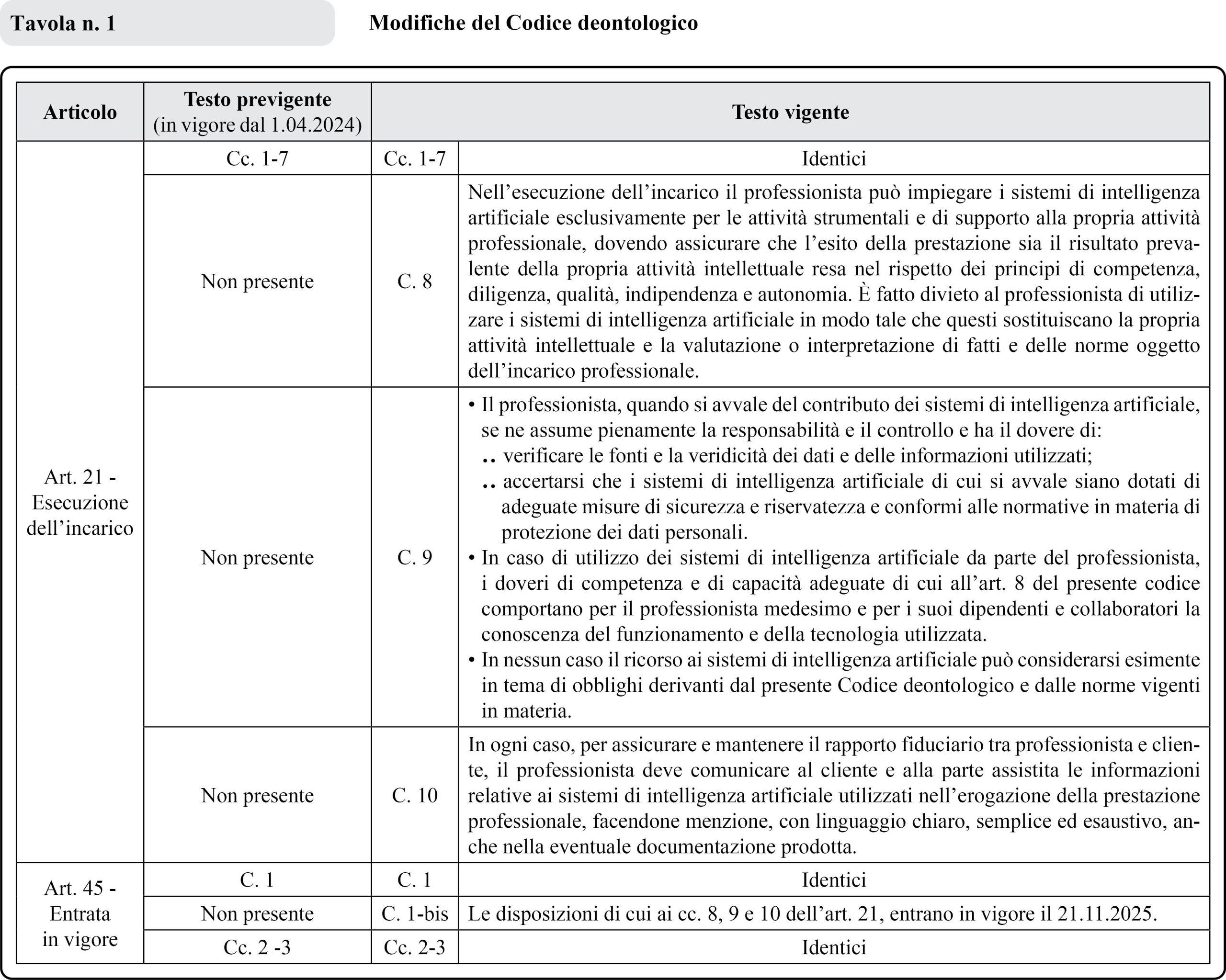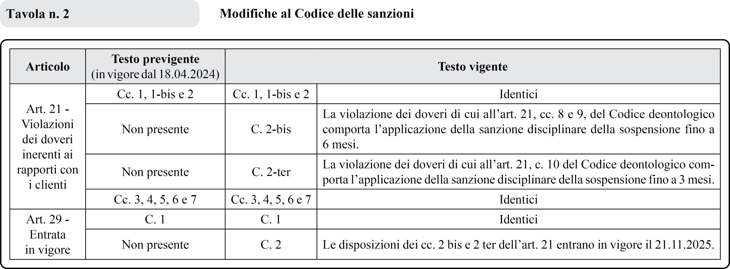 Le modifiche apportate alla versione del Codice precedente, risalente ad aprile 2024, riguardano gli artt. 21 e 45 del Codice deontologico e gli artt. 21 e 29 del Codice delle sanzioni e sono applicabili dal 21.11.2025.