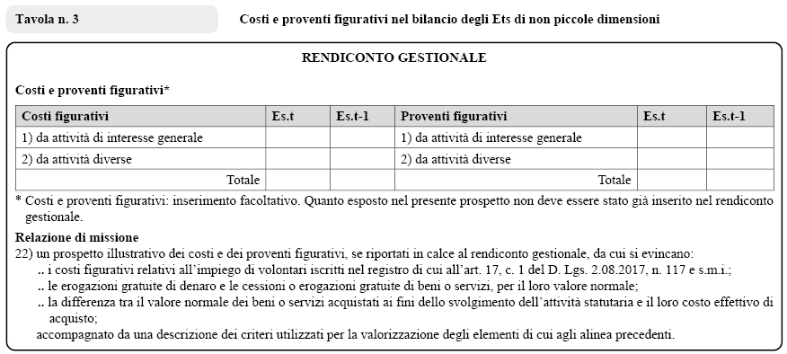| Esempi | Un esempio di costi figurativi è dato dall’impiego di volontari iscritti nel registro di cui all’art. 17 del D. Lgs. 117/2017. La valutazione è riferibile alla traduzione in termini economici dell’apporto che gli stessi volontari forniscono attraverso lo svolgimento della propria attività personale, spontanea e gratuita. |
