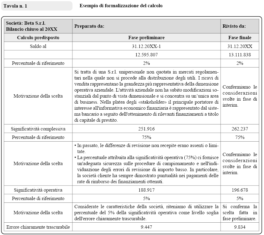 Le risultanze del calcolo della significatività devono essere documentate dal revisore nelle sue carte di lavoro con le note relative ai fattori considerati ai fini della loro determinazione.