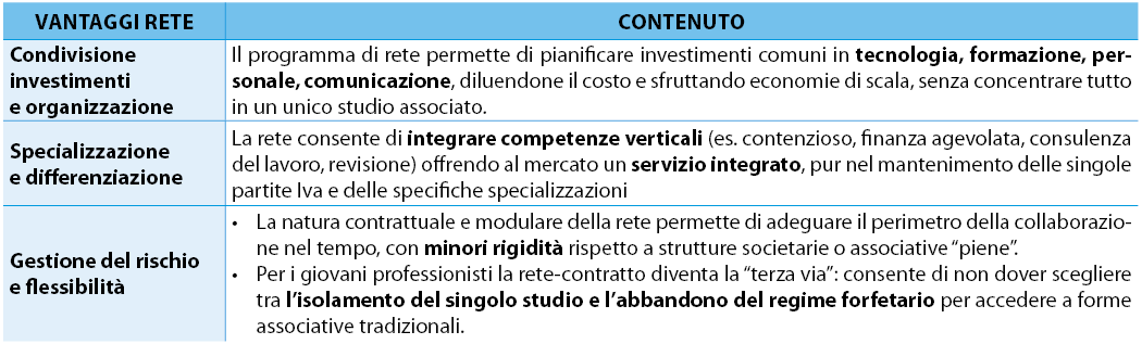 Il contratto di rete (art. 3, c. 4-ter D.L. 5/2009) inizialmente riservato ai soli imprenditori è stato allargato ai professionisti dall’ art. 12 L. 81/2017, rappresenta uno strumento di integrazione orizzontale di crescente interesse poiché permette a un gruppo di professionisti di: