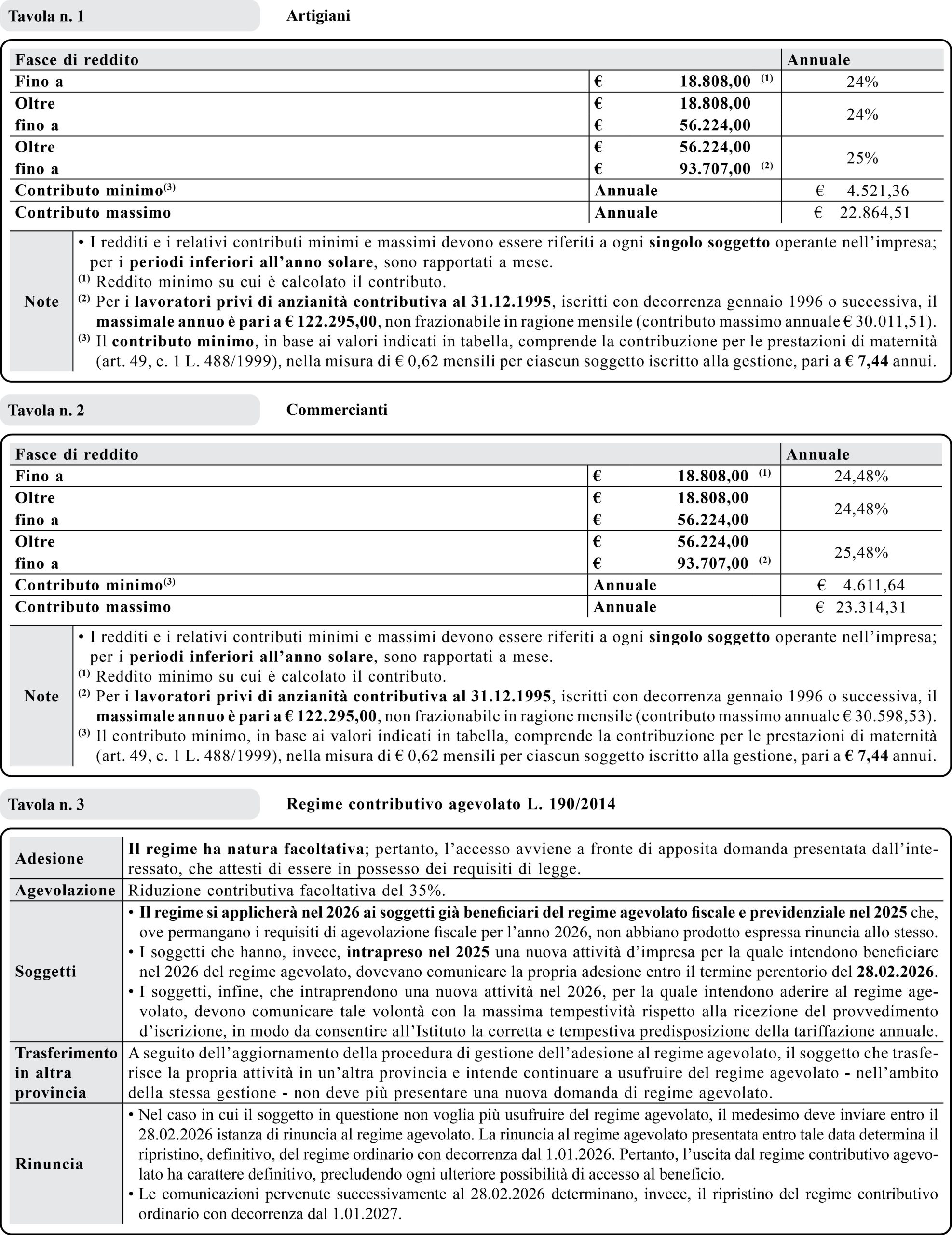 Le aliquote contributive per il finanziamento delle gestioni dei lavoratori artigiani e commercianti, per l’anno 2026, sono pari al 24%. È dovuto, inoltre, un contributo per le prestazioni di maternità stabilito nella misura di € 0,62 mensili. Per i soli iscritti alla gestione degli esercenti attività commerciali, alla predetta aliquota dovrà essere sommato lo 0,48%, a titolo di aliquota aggiuntiva, ai fini dell’indennizzo per la cessazione definitiva dell’attività commerciale. Continuano ad applicarsi, anche per il 2026, le disposizioni relative alla riduzione del 50% dei contributi dovuti dai soggetti con più di 65 anni di età già pensionati. L’art. 1, c. 186 L. 207/2024 ha previsto una riduzione contributiva in misura del 50% dei contributi previdenziali dovuti a favore dei lavoratori che si sono iscritti nel corso dell’anno 2025 per la prima volta a una delle Gestioni speciali autonome degli artigiani e dei commercianti che percepiscono redditi di impresa, anche in regime forfetario. I dati e gli importi utili per il pagamento della contribuzione dovuta da artigiani e commercianti sono pubblicati nel Cassetto previdenziale, nella sezione “Dati del mod. F24”, cui può accedere il contribuente o un suo delegato. Attraverso tale opzione è possibile, inoltre, visualizzare e stampare in formato PDF, il modello da utilizzare per effettuare il pagamento.