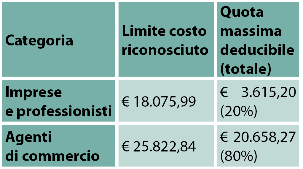 Quota servizi: le spese per i servizi accessori (manutenzione, assicurazione, ecc.) incluse nel canone sono deducibili nella misura del 20% per imprese e professionisti e dell’80% per gli agenti, ma a differenza della quota puramente locativa, non sono soggette a un limite massimo di spesa annuo.