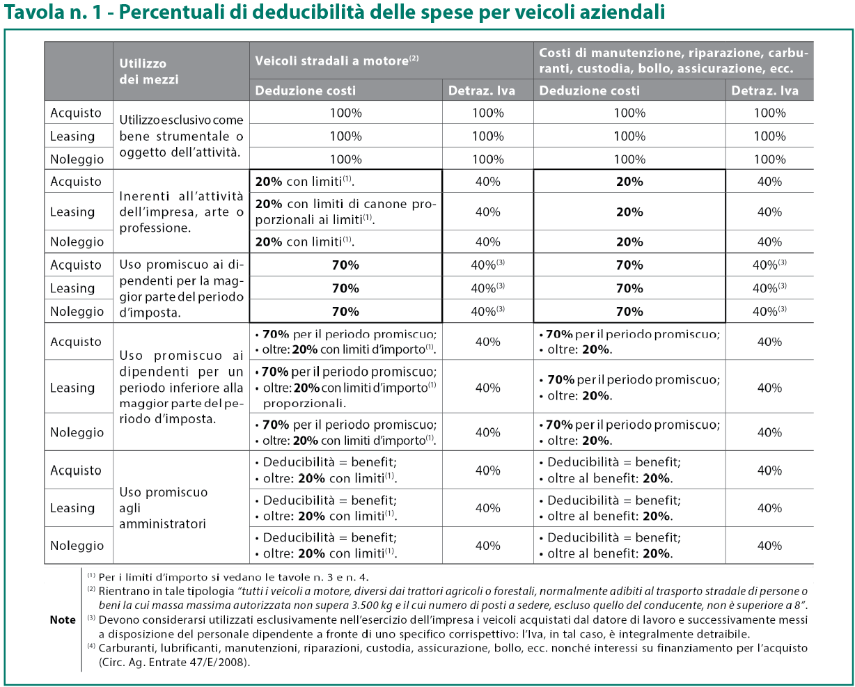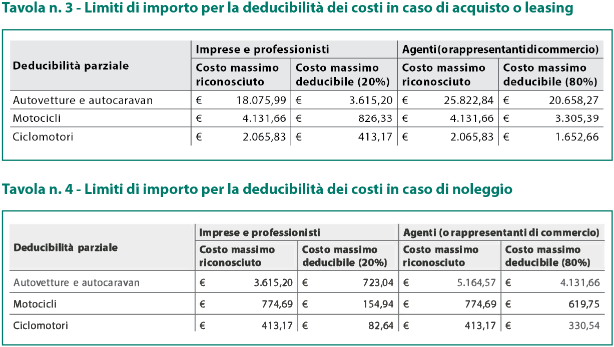Per le autovetture, autocaravan, ciclomotori e motocicli, la deducibilità delle spese (ammortamenti, canoni, carburanti, manutenzioni) segue queste aliquote:
