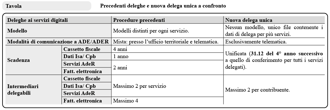 L’art. 21 D. Lgs. 1/2024 ha introdotto la delega unica che consente, con un’unica operazione, di comunicare i dati delle deleghe rilasciate agli intermediari riferite ad uno o più servizi online dell’Agenzia delle Entrate e dell’Agenzia delle Entrate-Riscossione, unificando anche le scadenze.