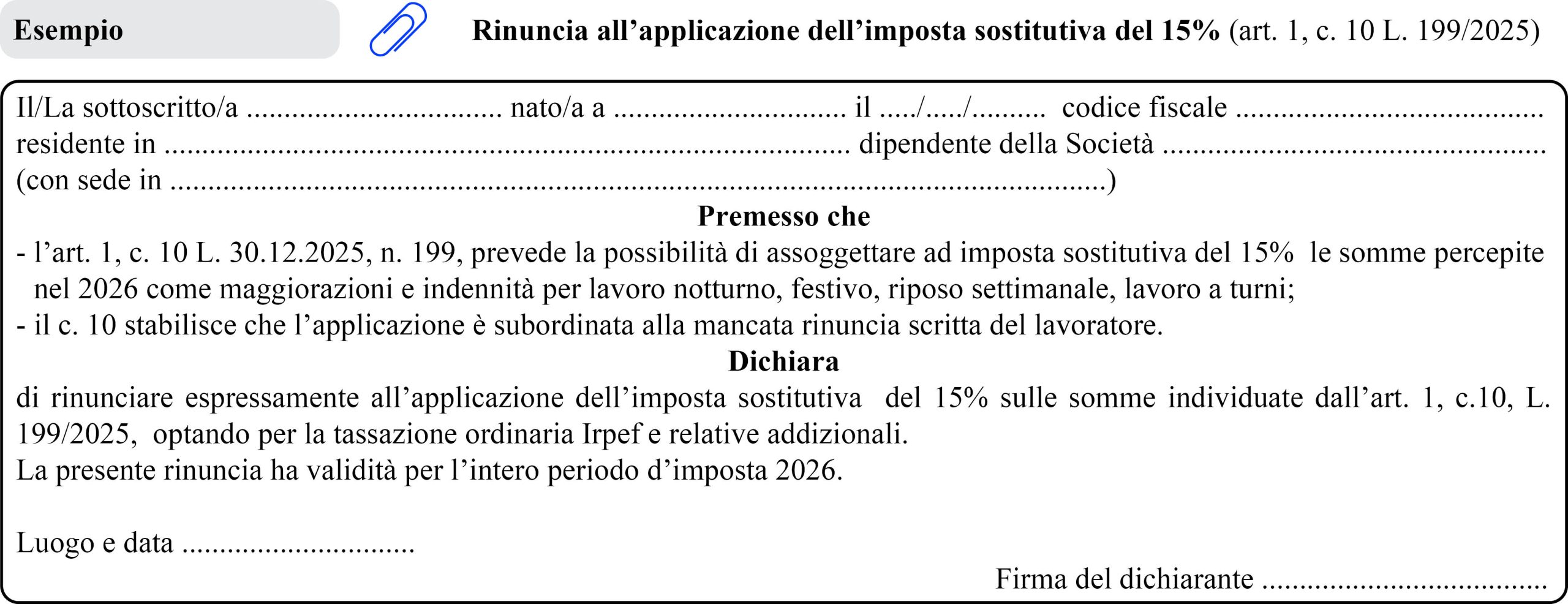 L’art 1, cc. 10 e 11 L. 30.12.2025, n. 199 prevede, per il periodo d’imposta 2026, che le somme corrisposte ai lavoratori dipendenti del settore privato a titolo di maggiorazioni e indennità per lavoro notturno, per lavoro prestato nei giorni festivi e nei giorni di riposo settimanale, nonché di indennità di turno e ulteriori emolumenti connessi al lavoro a turni, sono assoggettate, salva espressa rinuncia scritta del prestatore di lavoro, a un’imposta sostitutiva dell’imposta sul reddito delle persone fisiche e delle addizionali regionali e comunali pari al 15%, alle condizioni indicate. Per consentire ai sostituti d’imposta il versamento, tramite modello F24, dell’imposta sostitutiva in argomento, l’Agenzia ha istituito i relativi codici tributo con risoluzione 2/E/2026.