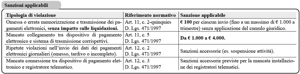 La sanzione compresa tra € 1.000 e € 4.000, disciplinata dall’art. 11, c. 5 D. Lgs. 471/1997, è estesa ai casi di mancato collegamento tra il dispositivo per i pagamenti elettronici e il sistema di registrazione e trasmissione dei corrispettivi.