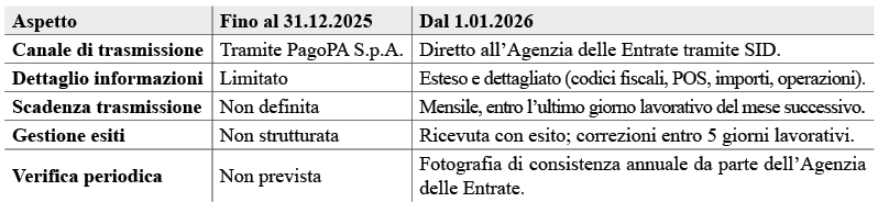 Dal 1.01.2026: viene meno l’intermediazione di PagoPA. I Prestatori di servizi di pagamento dovranno inviare le informazioni direttamente all’Agenzia delle Entrate attraverso il Sistema di Interscambio Flussi Dati (SID), con conseguente snellimento delle procedure e riduzione dei passaggi.