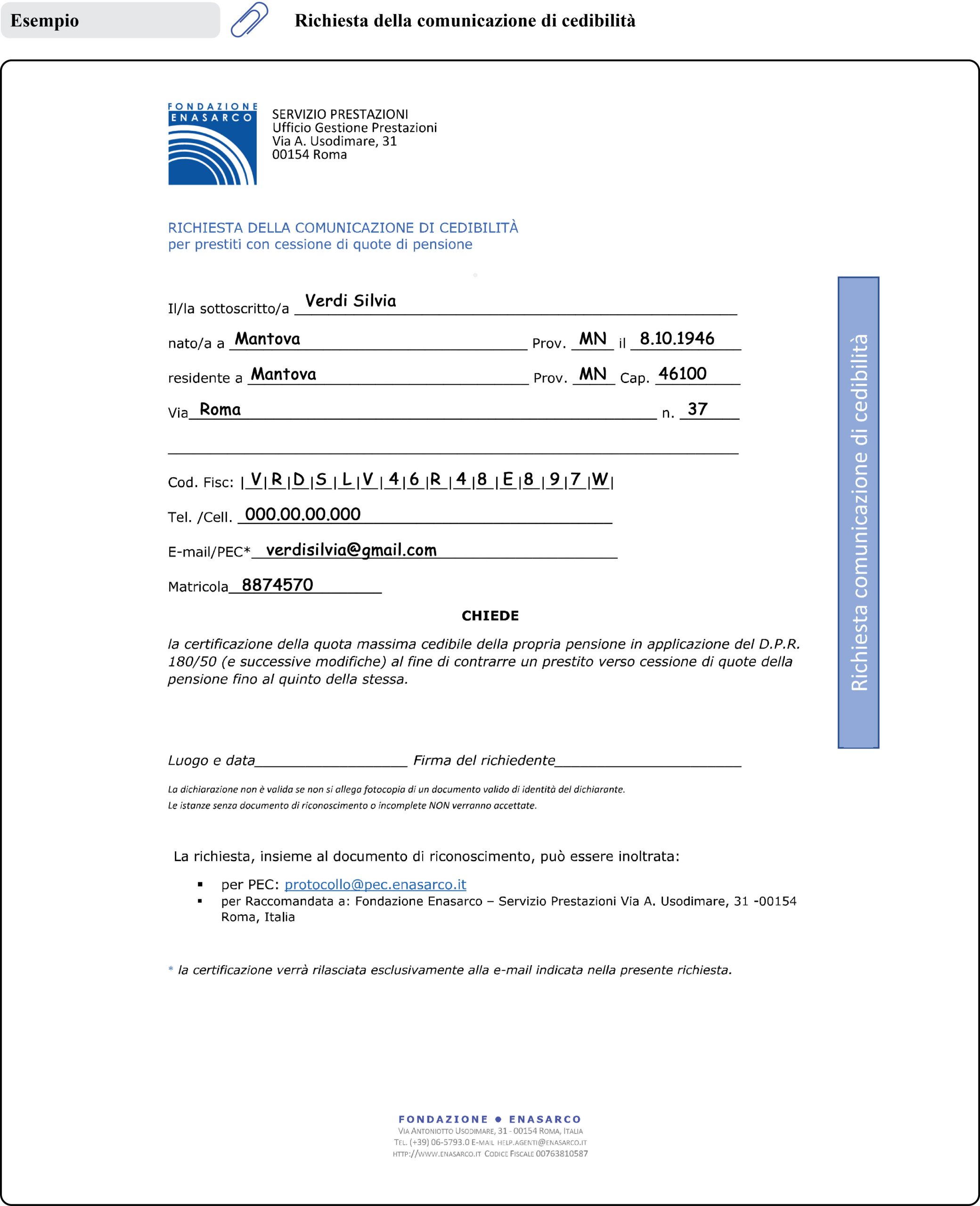 – raccomandata a: Fondazione Enasarco – Servizio Prestazioni – Ufficio Gestione Prestazioni – Via A. Usodimare, 31 – 00154 Roma.