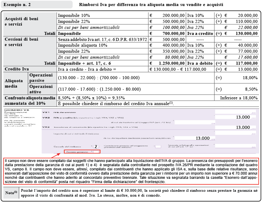 Il rimborso del credito emergente dalla dichiarazione annuale deve essere chiesto mediante la compilazione del rigo VX4. È pari a € 30.000 l’importo dei rimborsi che possono essere eseguiti senza prestazione di garanzia. Per gli importi superiori a € 30.000 la garanzia è alternativa alla presentazione della dichiarazione munita di visto di conformità (o sottoscrizione dell’organo di controllo) e di dichiarazione sostitutiva attestante la sussistenza dei requisiti patrimoniali e di versamento dei contributi per rimborsi chiesti da soggetti non “a rischio”. Devono, pertanto, essere considerate separatamente la soglia di € 5.000, oltre la quale è richiesta l’apposizione del visto di conformità per le compensazioni e quella di € 30.000, prevista per i rimborsi. Per quanto riguarda le somme in compensazione il riferimento è all’utilizzo e non all’ammontare complessivo del credito. La quota parte del rimborso per la quale il contribuente intende utilizzare la procedura semplificata di rimborso, cumulata con gli importi che sono stati o che saranno compensati nel corso dell’anno nel modello F24, non può superare il limite di € 2.000.000,00.